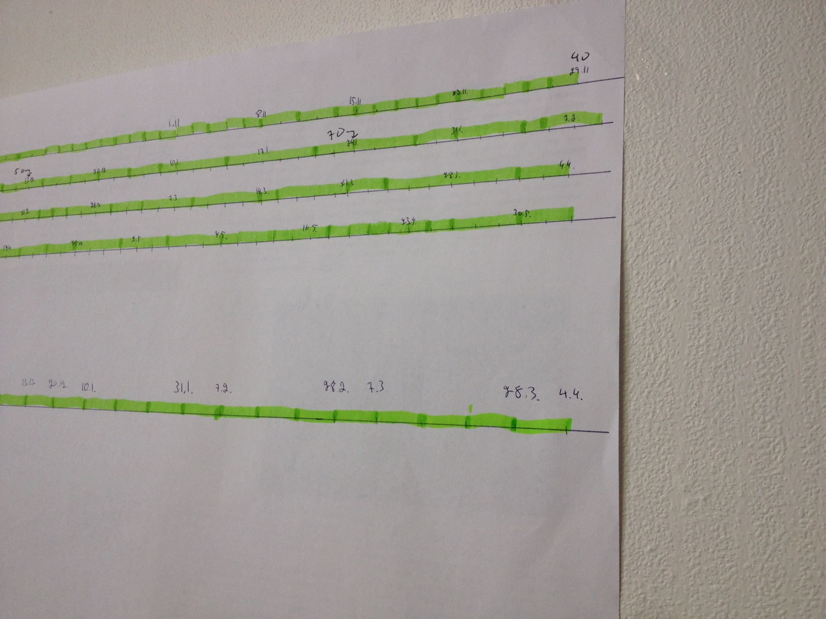 Teippasin viime syksynä kirjoituskoppini seinälle aakolmosen, jolle vedin molempia kirjoja varten oman viivan. Jaoin viivat osiin, jatkosotakirjan osalta viikkojen (160) ja sankarikirjan osalta sen päähenkilöiden määrän mukaan (20). Työn edetessä merkitsin aikaansaamiseni yliviivaustussilla. Ideana oli, saisin käsikirjoitukset valmiiksi jo keväällä, jolloin kesäkuu jäisi taiton tarkistuksille ja muutenkin varakuukaudeksi mahdollisesti venähtävää aikataulua varten. Heinäkuussa voisin jo lomailla. No, en nyt ole lomalla. Syy selviää kohta.