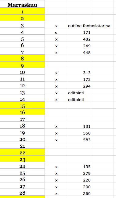 maanantai on huonoin kirjoitusaamu ainakin sanamäärää katsottaessa. Viikon loppua kohti tahti kiristyy, kun tekstiin pääsee yhä paremmin sisään.